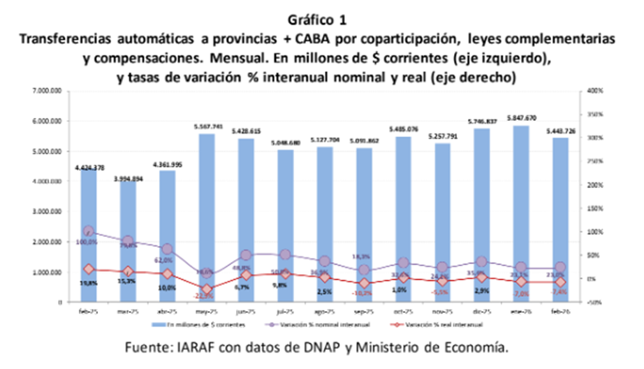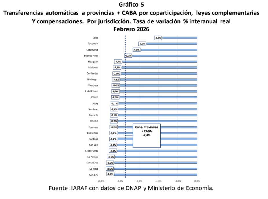 En el preámbulo de la apertura de sesiones ordinarias los datos fiscales arrojados por IARAF son alarmantes, según el instituto, el mes de febrero de 2026, el gobierno Nacional envió al consolidado de provincias más CABA $5.443.000 millones en concepto de Coparticipación, leyes especiales y compensaciones, frente a $4.424.000 millones enviados durante igual período del año anterior. Es decir que se observó una variación nominal del 23%. Descontando el proceso inflacionario del período, esto se traduciría en una baja real del 7,4%. Por su parte, la coparticipación, es decir las transferencias automáticas menos leyes complementarias y compensaciones, habrían descendido un 8,8% real. Según la información suministrada por la DNAP, la caída de la coparticipación neta en febrero se debería principalmente a la disminución real interanual del 13% del IVA, mientras que el impuesto a las ganancias también mostró una variación negativa, del 0,8%. En conjunto la recaudación de IVA e IIGG habría registrado una baja real interanual del 8,3%. No obstante, la caída en la recaudación de impuestos internos de 16,6% generó que la coparticipación neta tuviera una variación negativa del 8,8%.